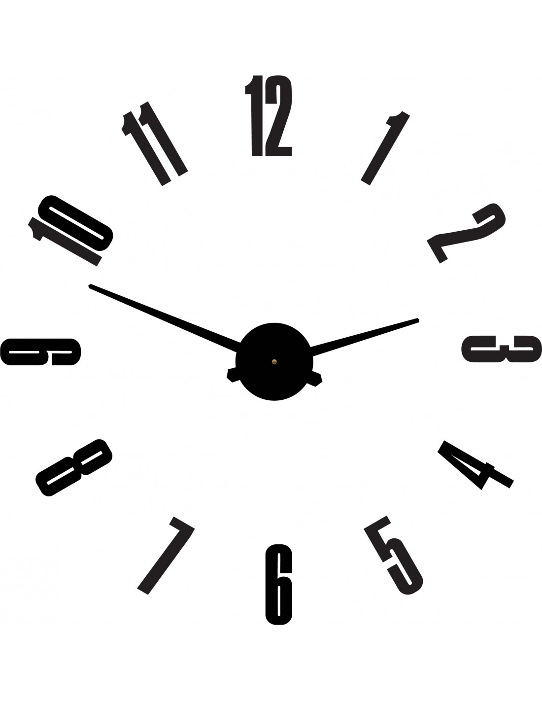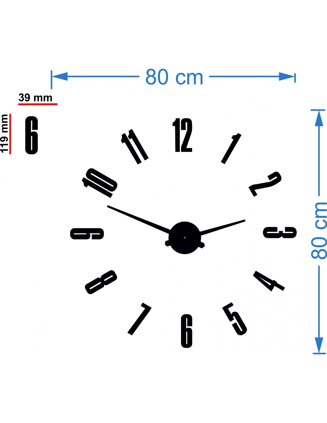 Rozmery nálepky: 800 x 800 mm možnosť zväčšovať až 1300 x 1300 mm. Rozmery hodinového strojčeka: 100 x 100 mm Dĺžka ručičiek: 30 - 40 cm.