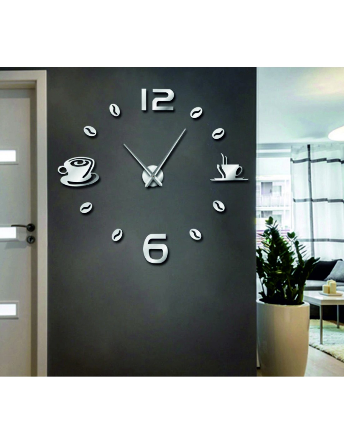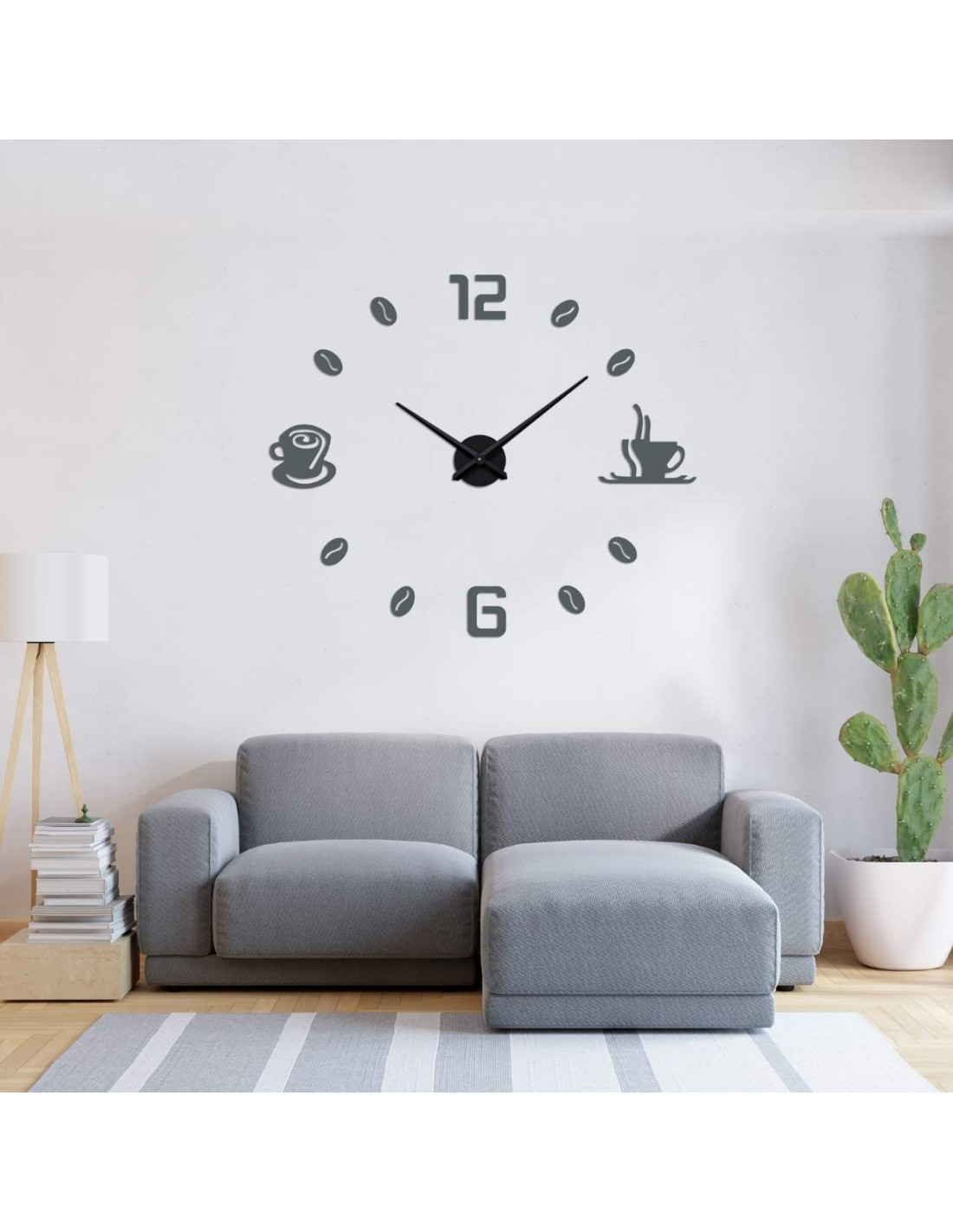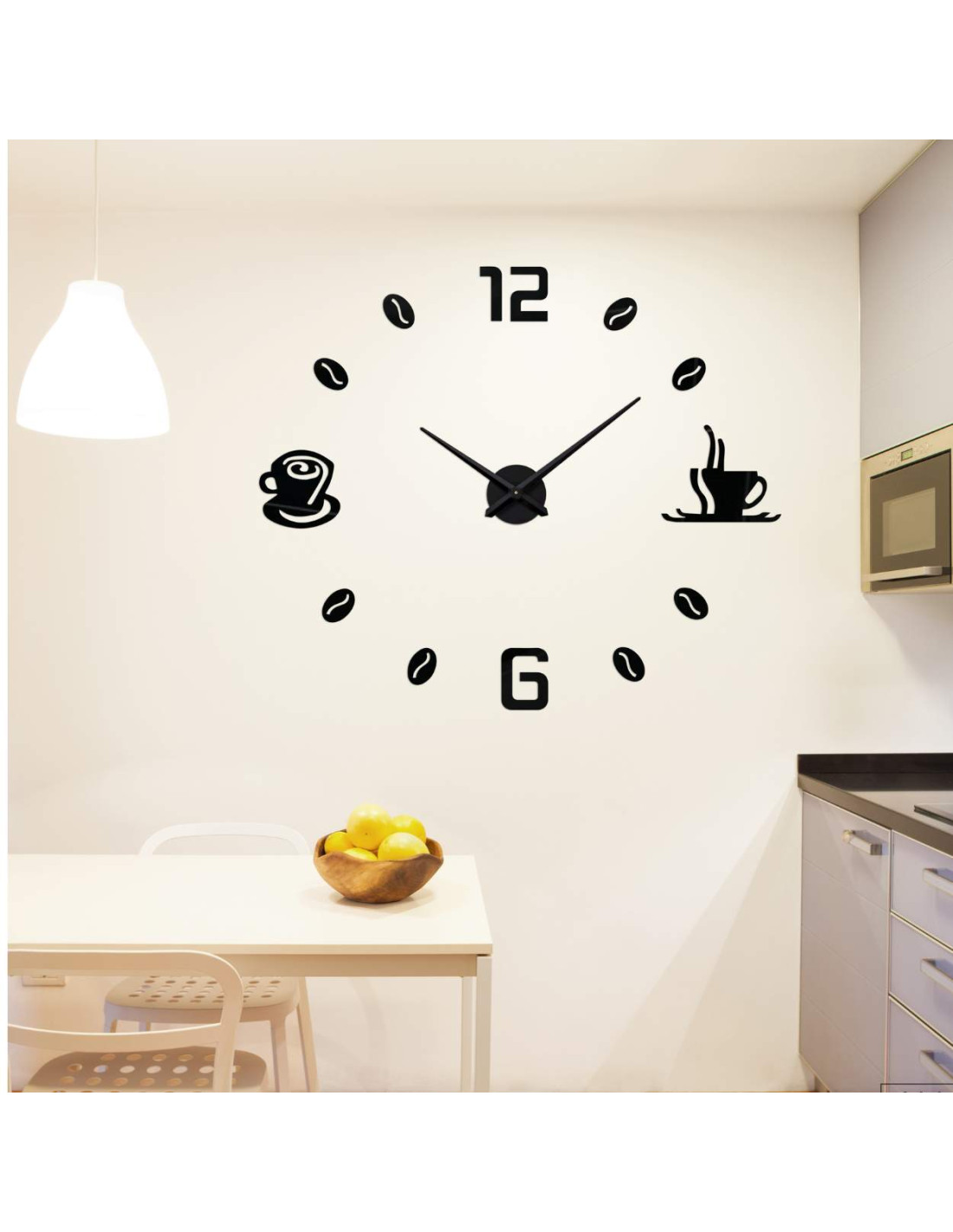 Čierne nalepovacie hodiny s minimalistickými kávovými šálkami a zrnami sú nielen praktickým, ale aj štýlovým doplnkom interiéru.