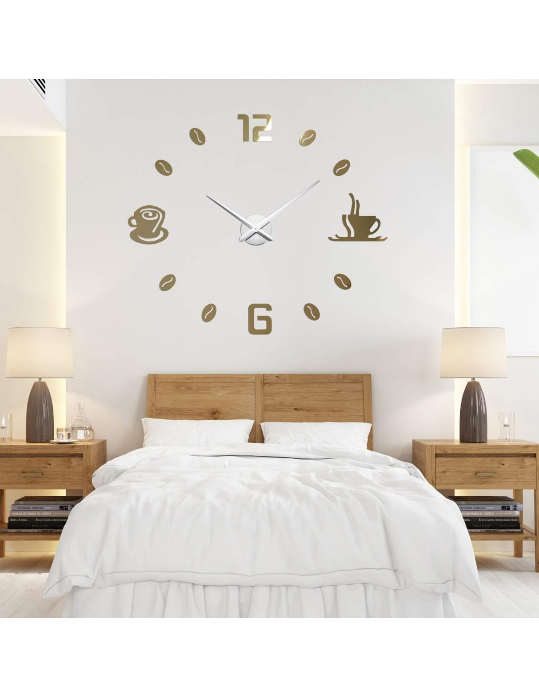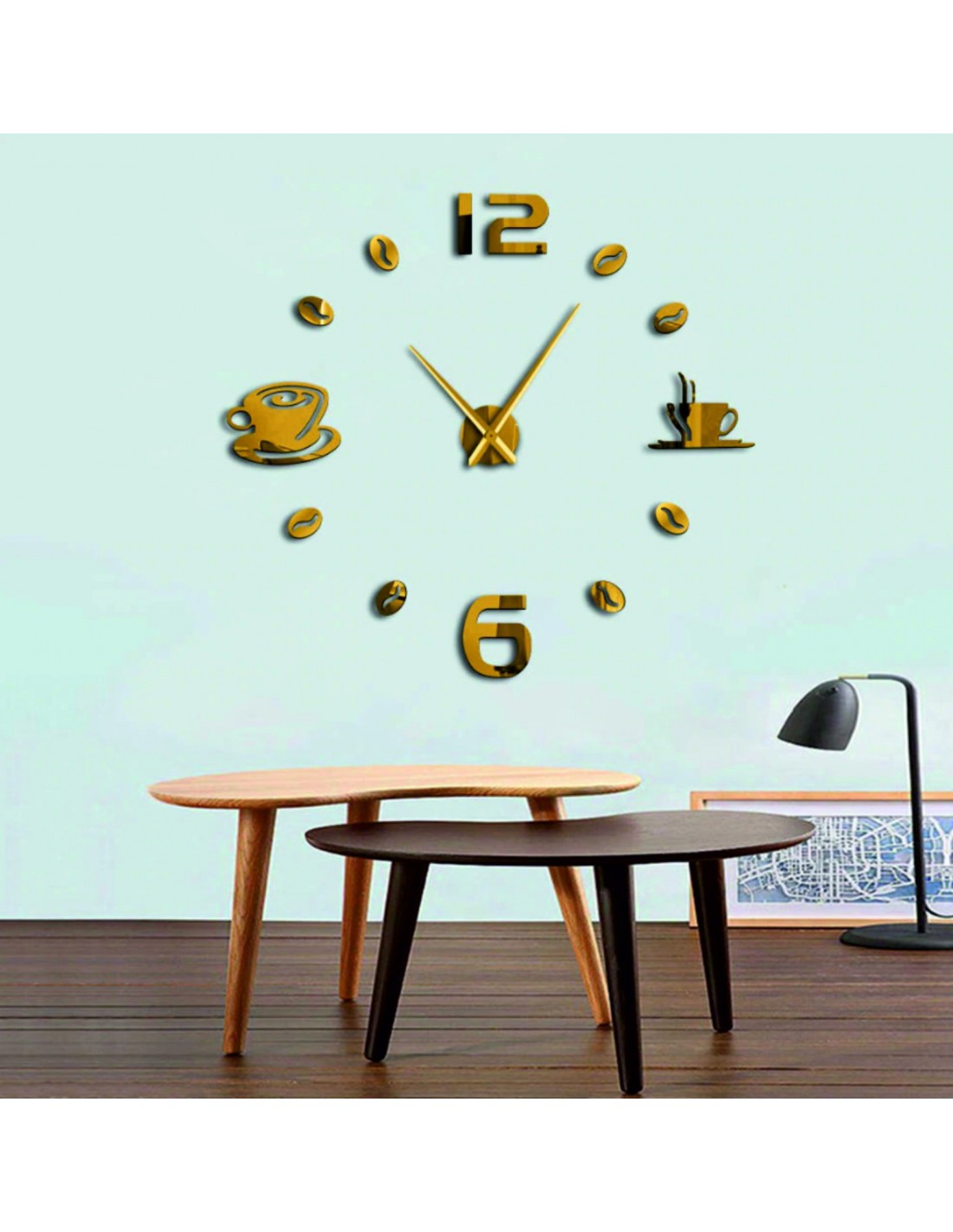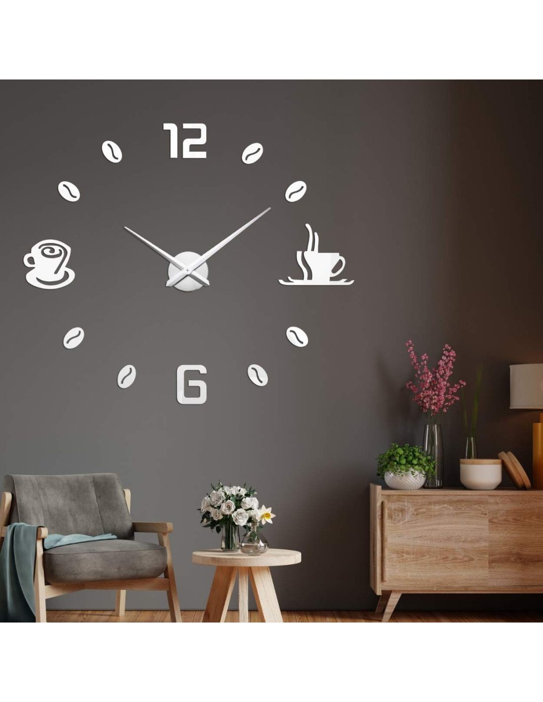 Čierne nalepovacie hodiny s minimalistickými kávovými šálkami a zrnami sú nielen praktickým, ale aj štýlovým doplnkom interiéru.