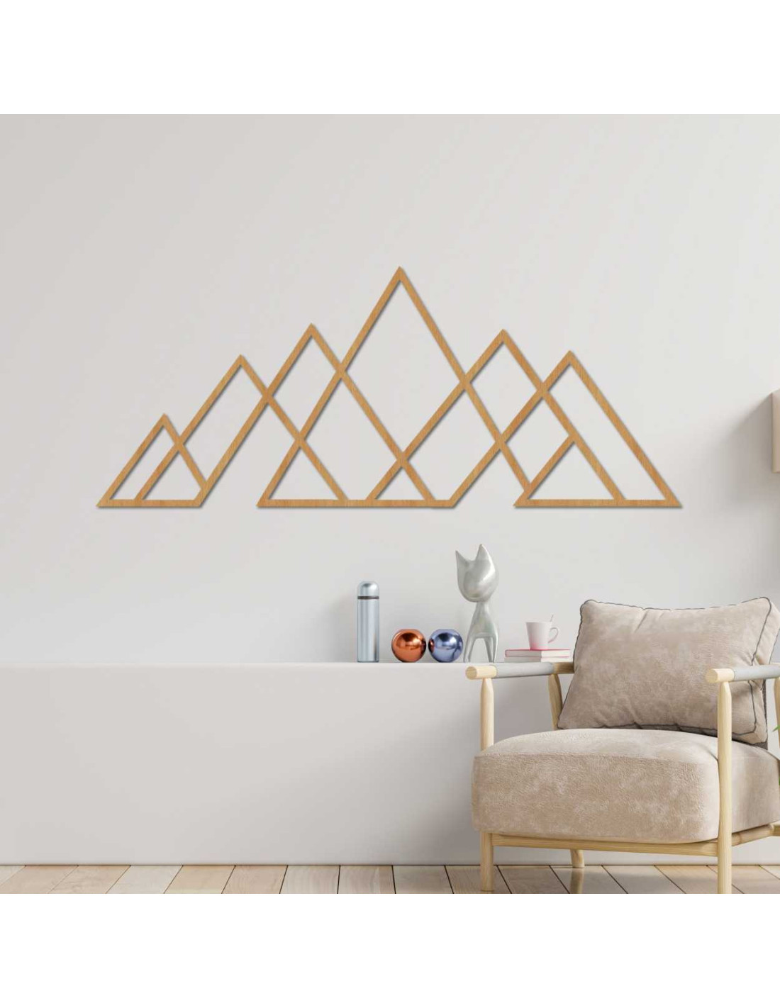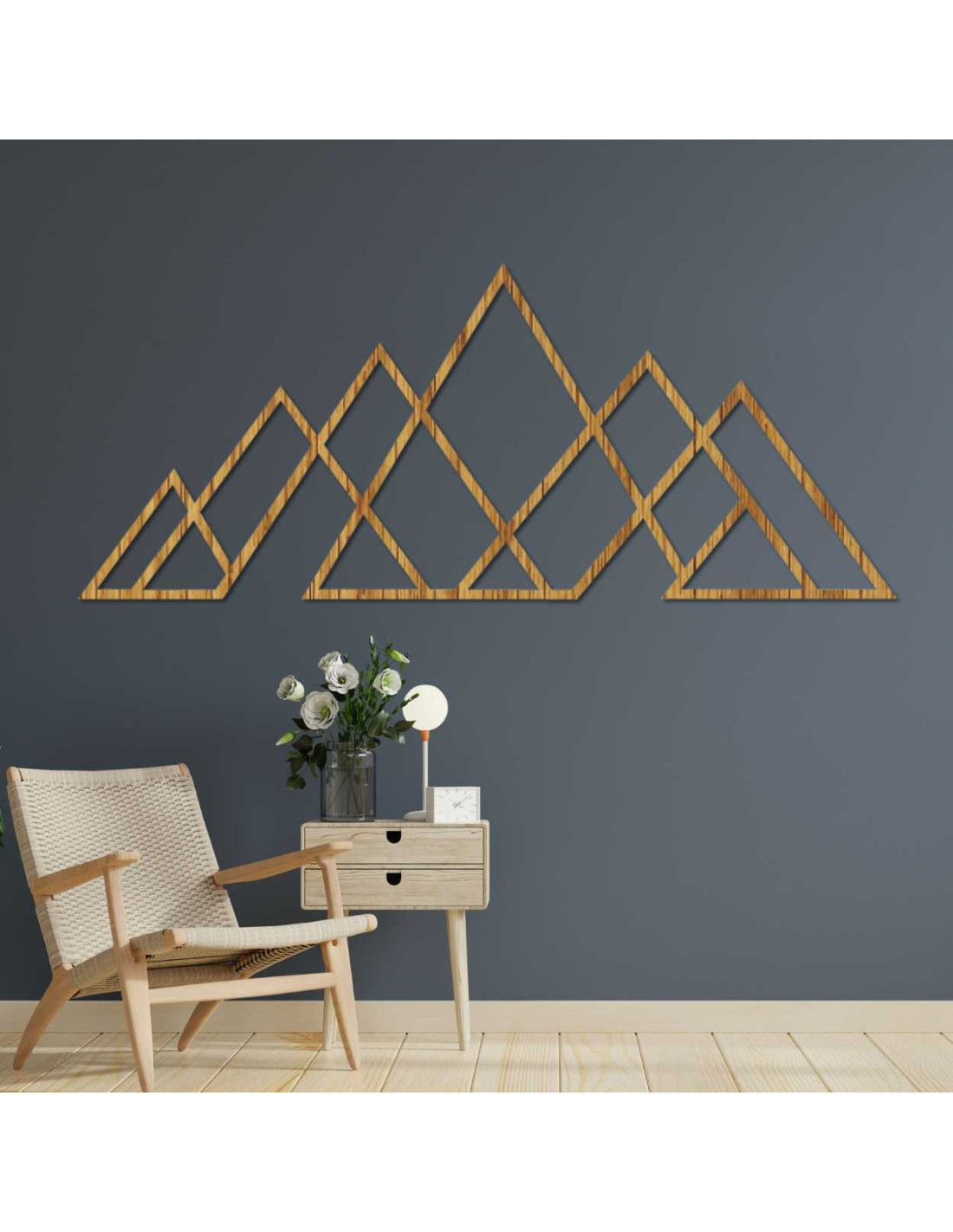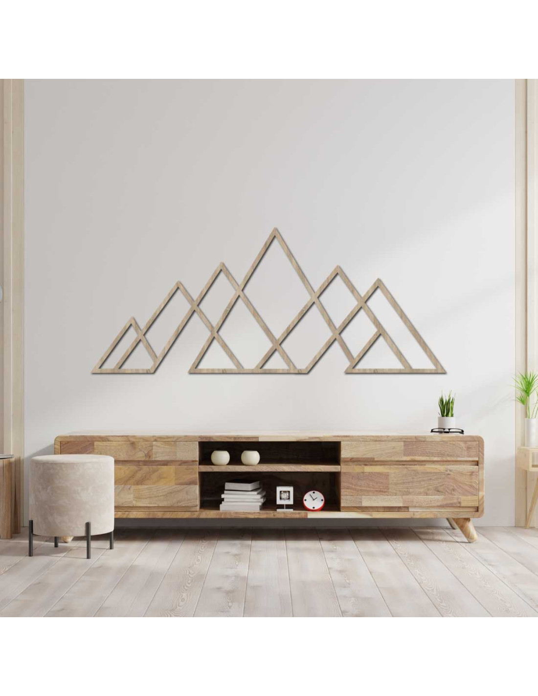 Minimalistický horský obraz z dreva – geometrická dekorácia s prírodným motívom do moderného interiéru.