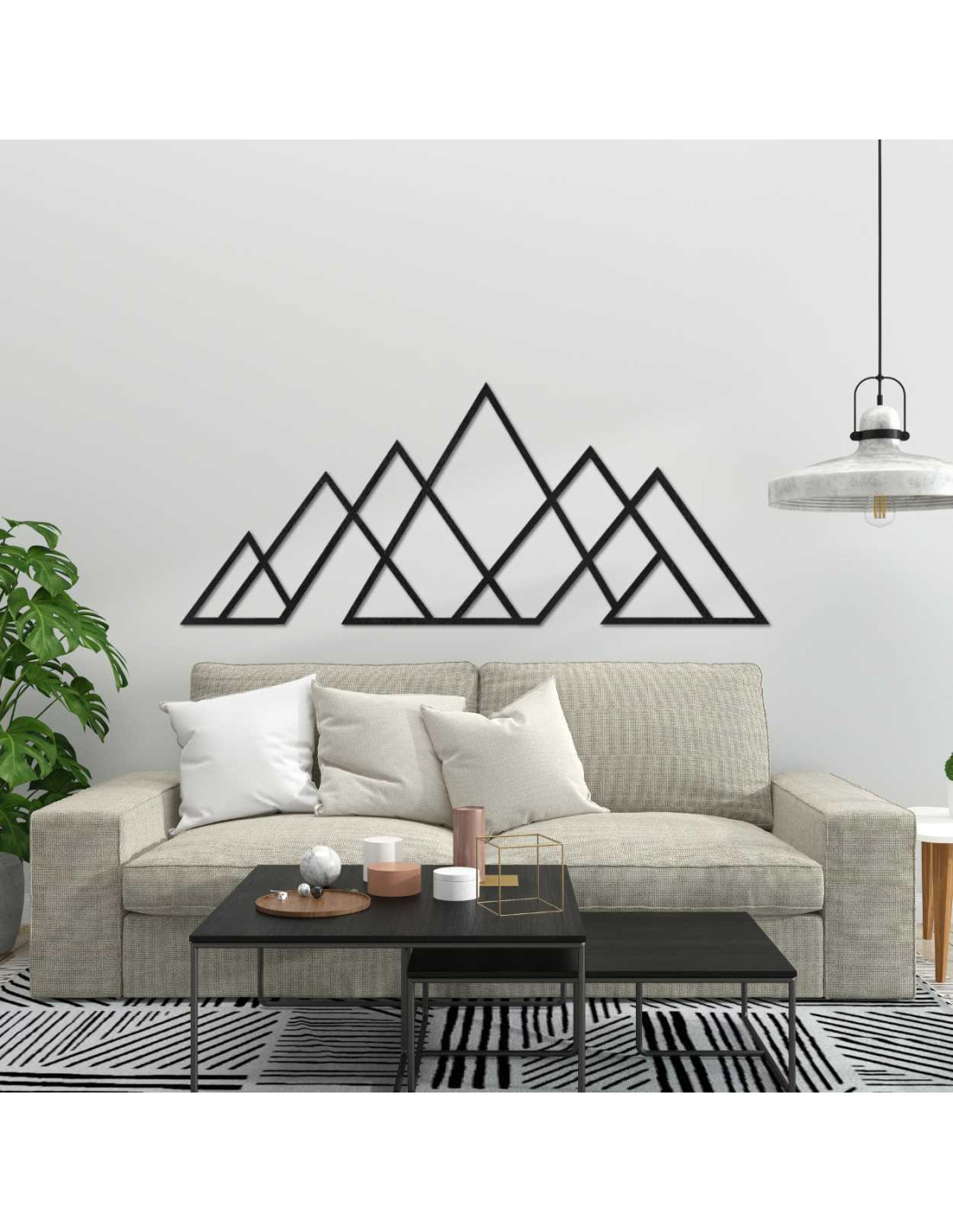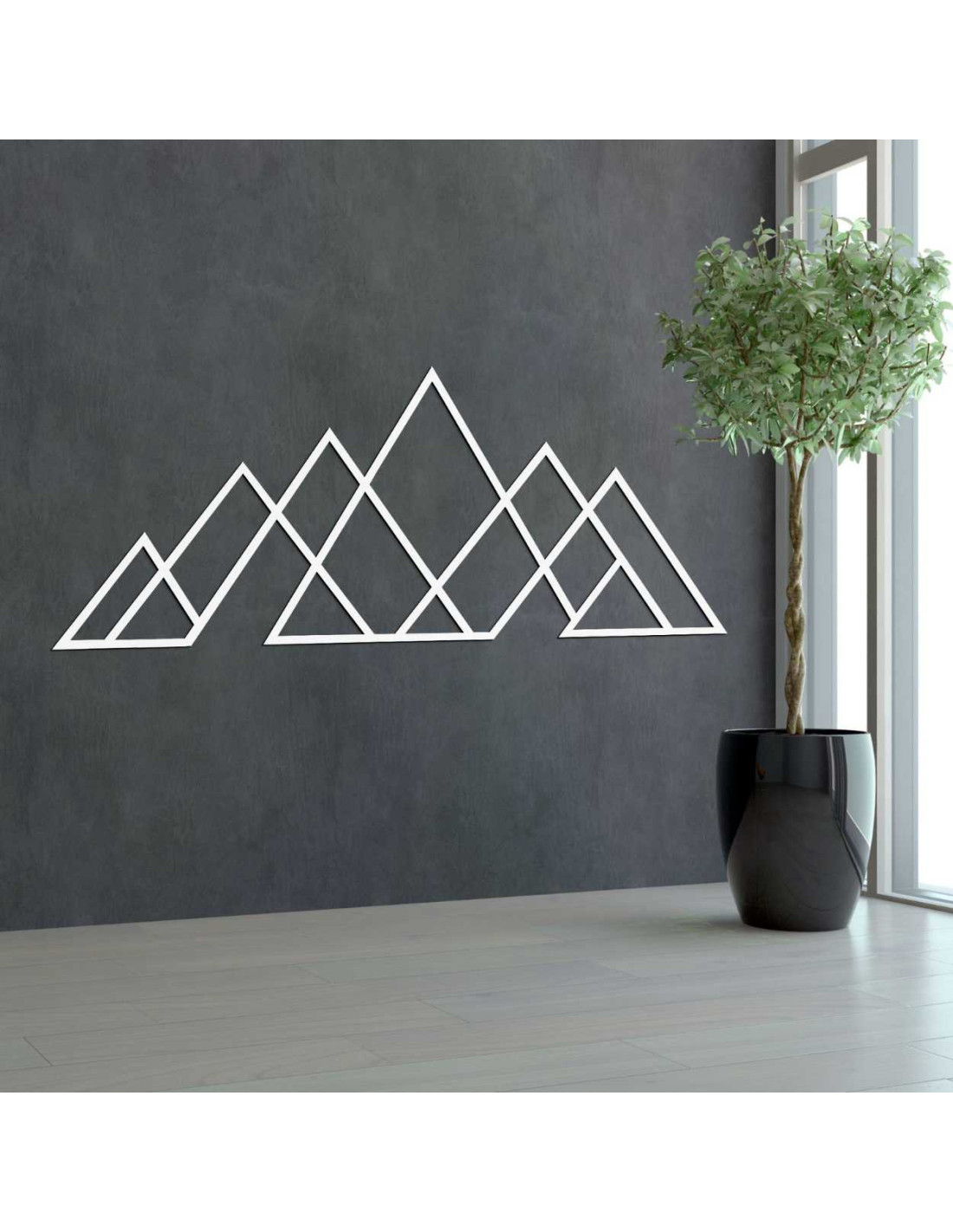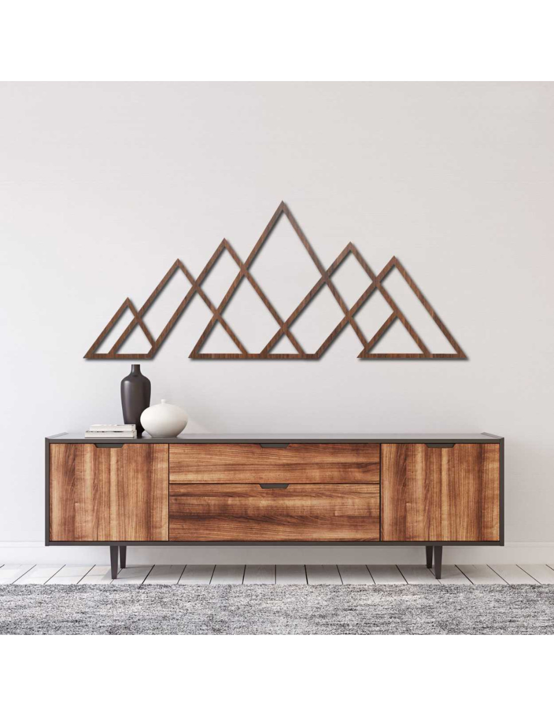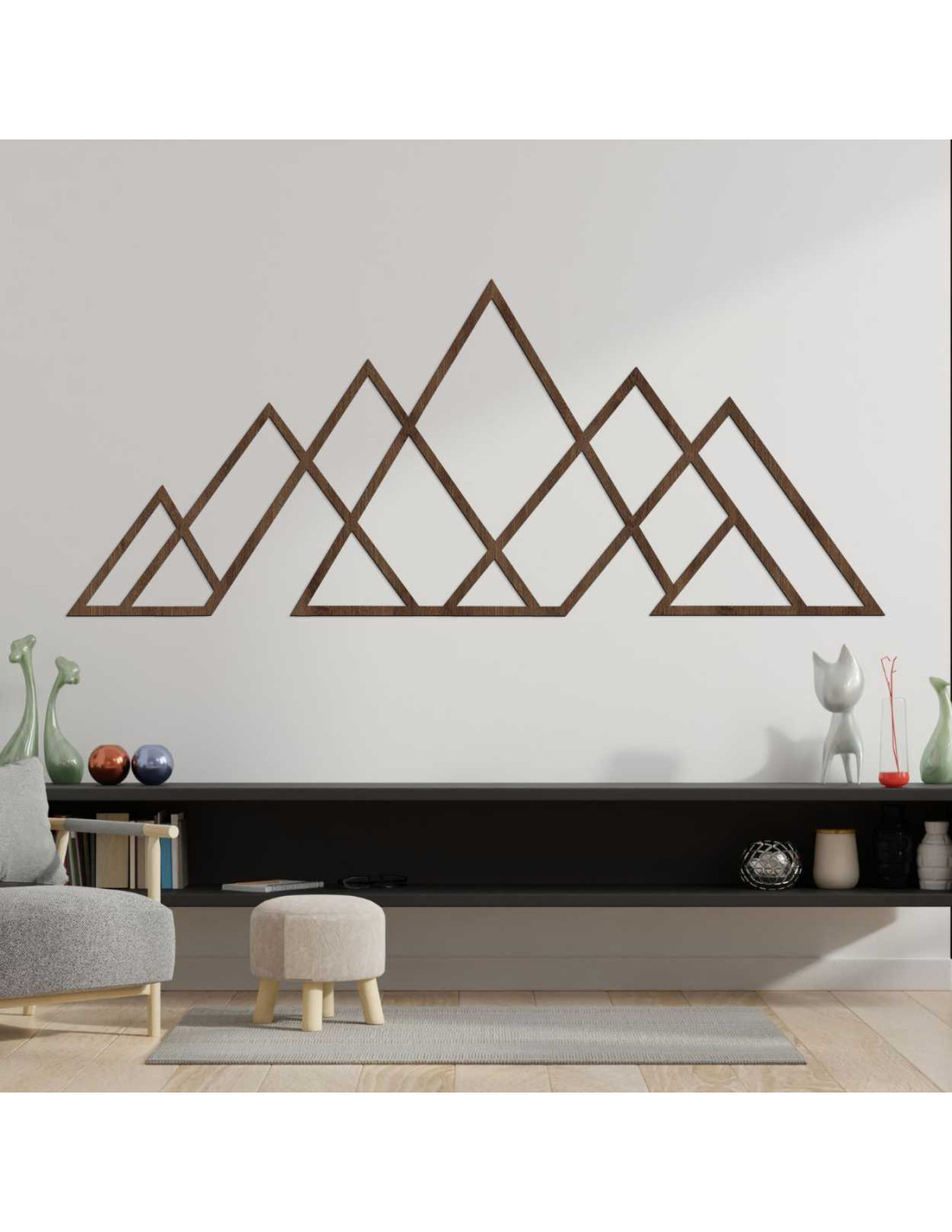 Minimalistický horský obraz z dreva – geometrická dekorácia s prírodným motívom do moderného interiéru.