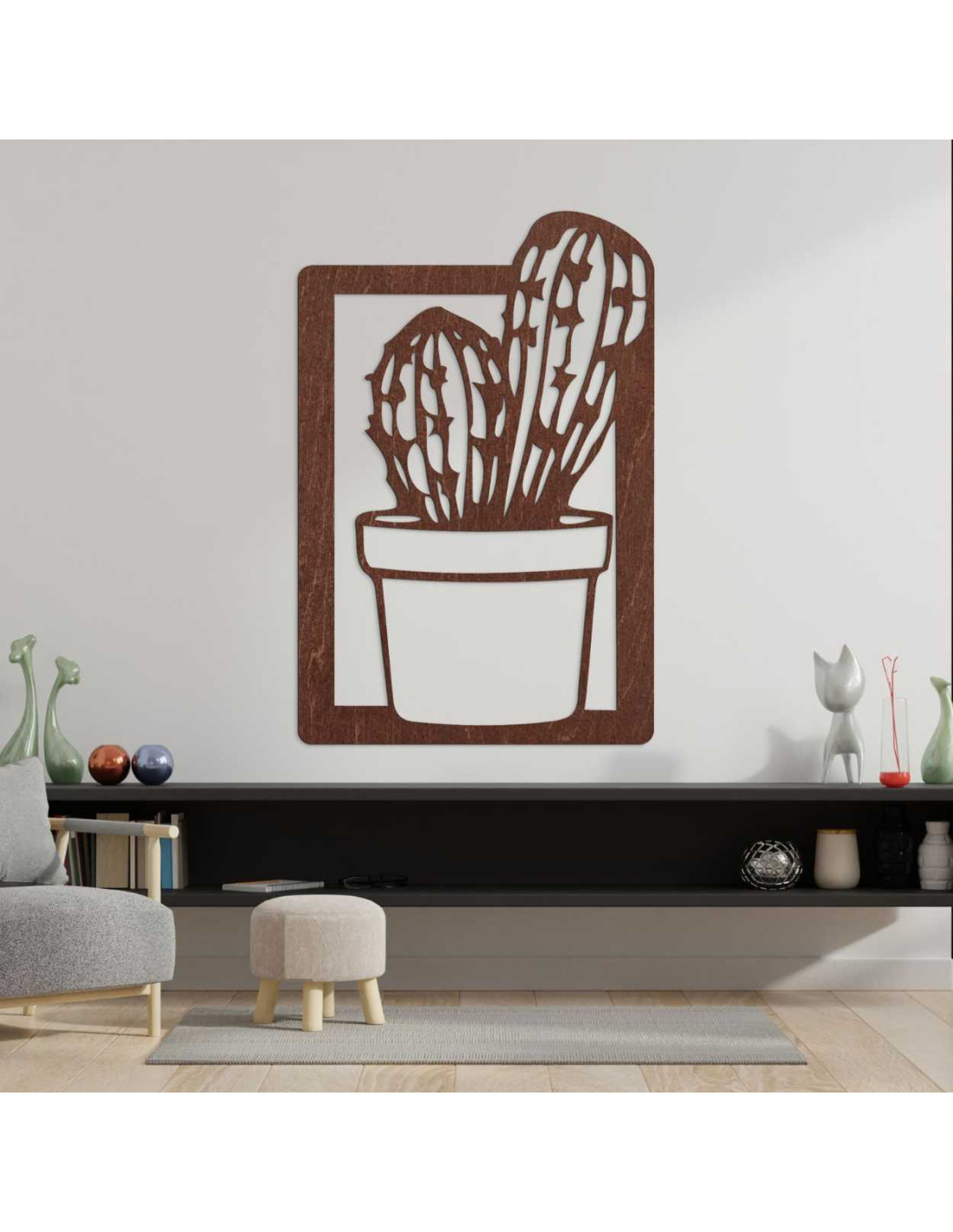 Štýlový drevený nástenný panel s kaktusom, vhodný do obývačky alebo kancelárie.