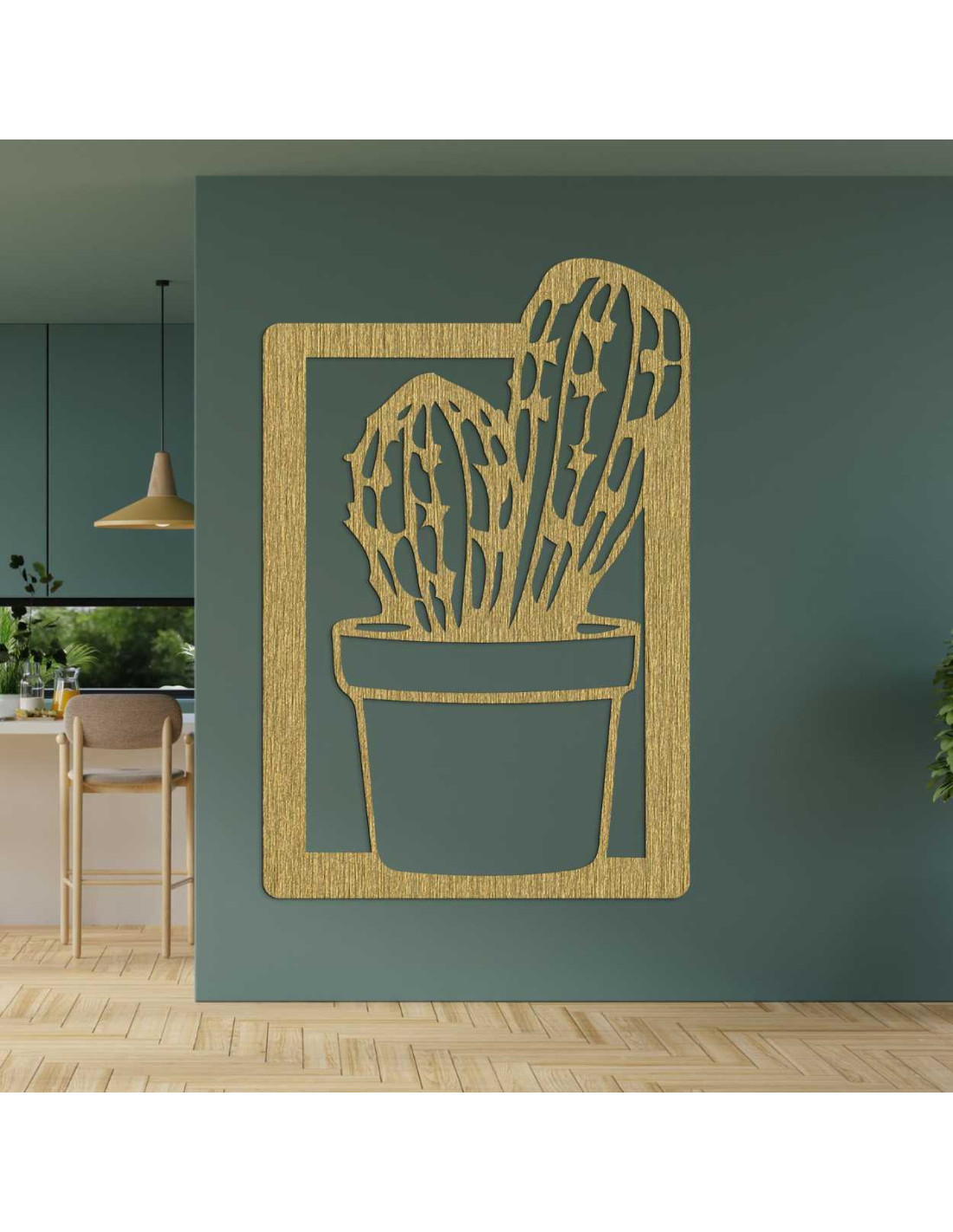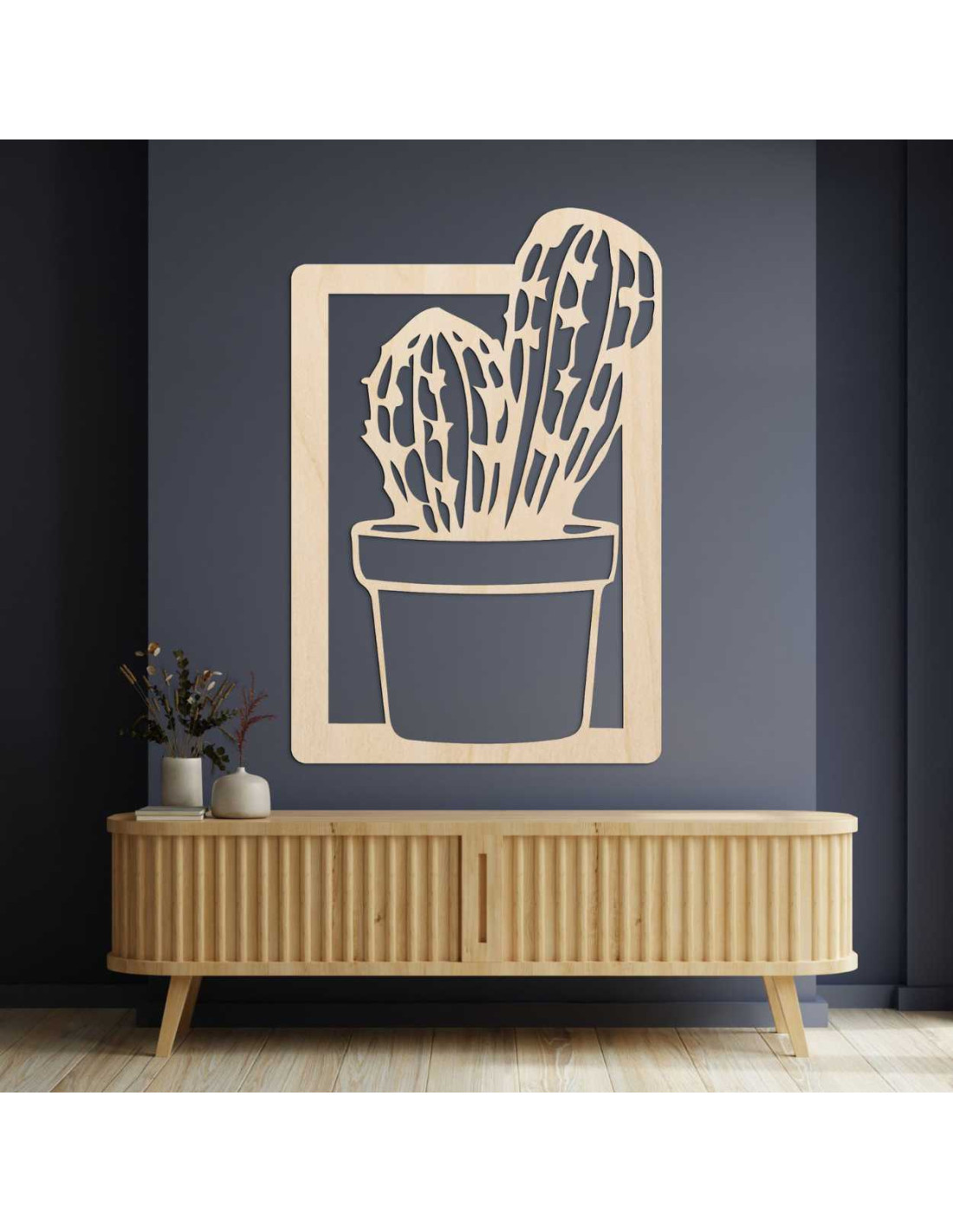 Veľký drevený nástenný obraz s vyrezávaným motívom kaktusu v kvetináči.