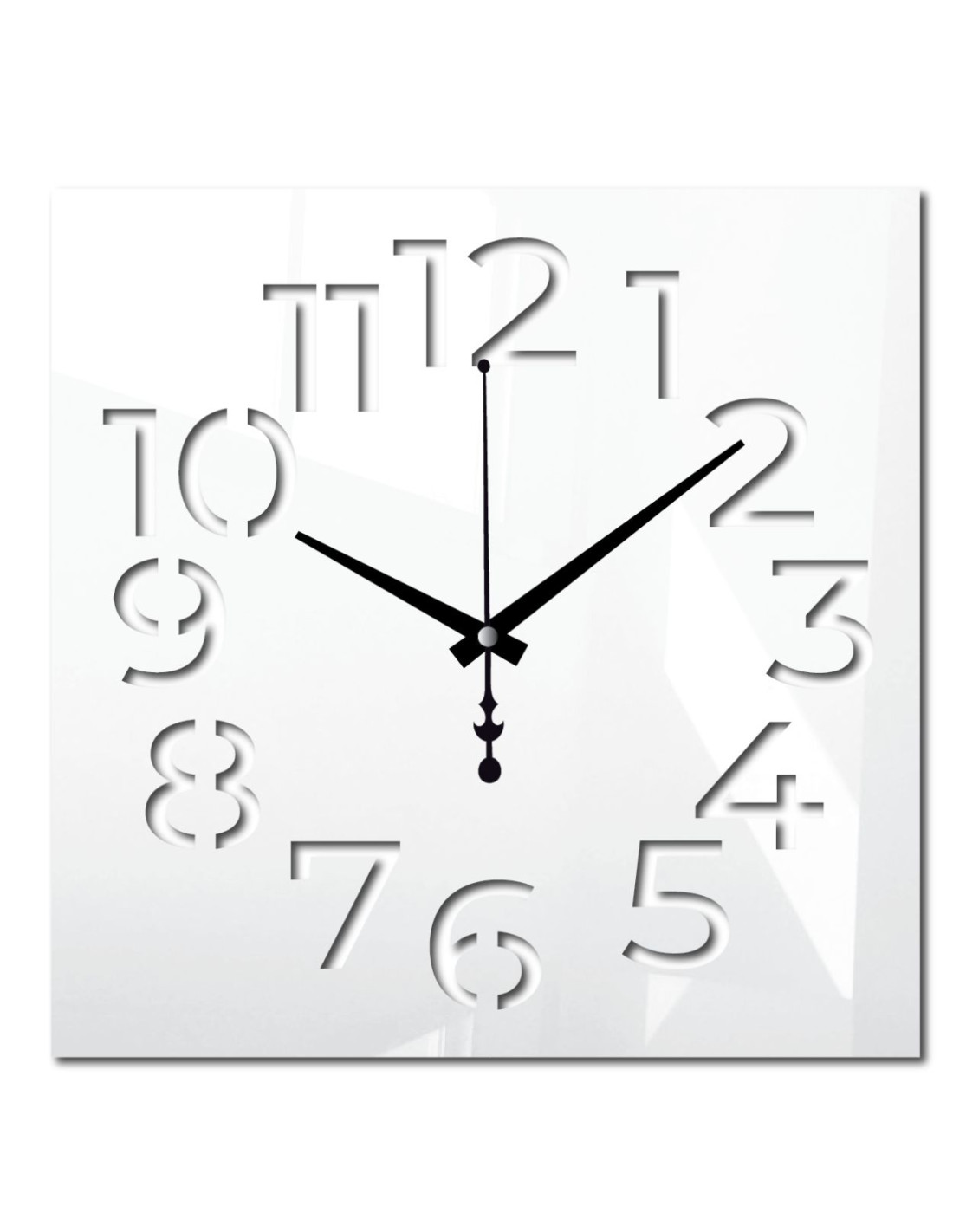 Štvorcové nástenné hodiny z plexiskla kombinujú moderný dizajn, kontrastné farby a čisté línie.