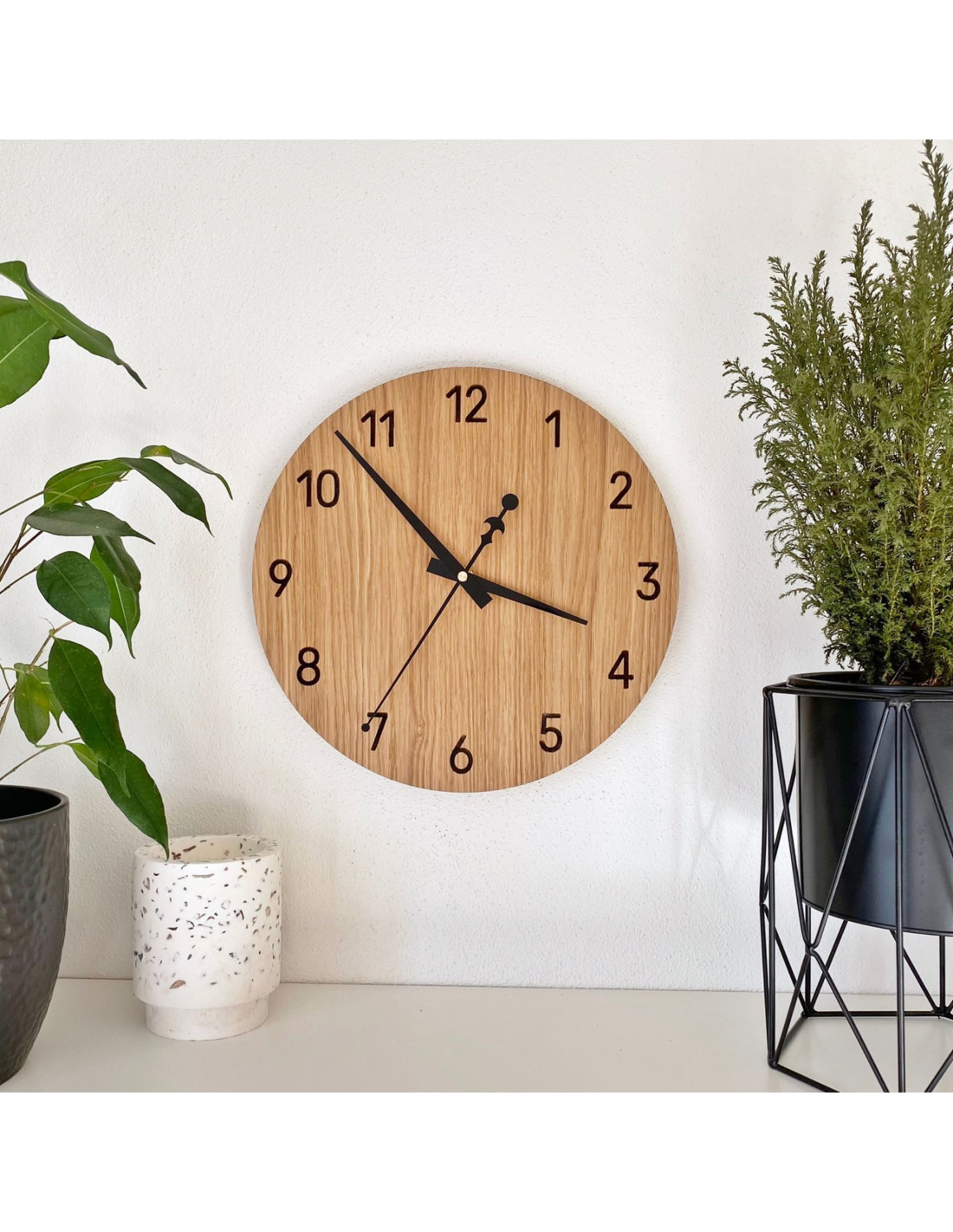 - Prírodný a elegantný dizajn: Dubové drevo a čierne kovové ručičky vytvárajú moderný, minimalistický štýl.
