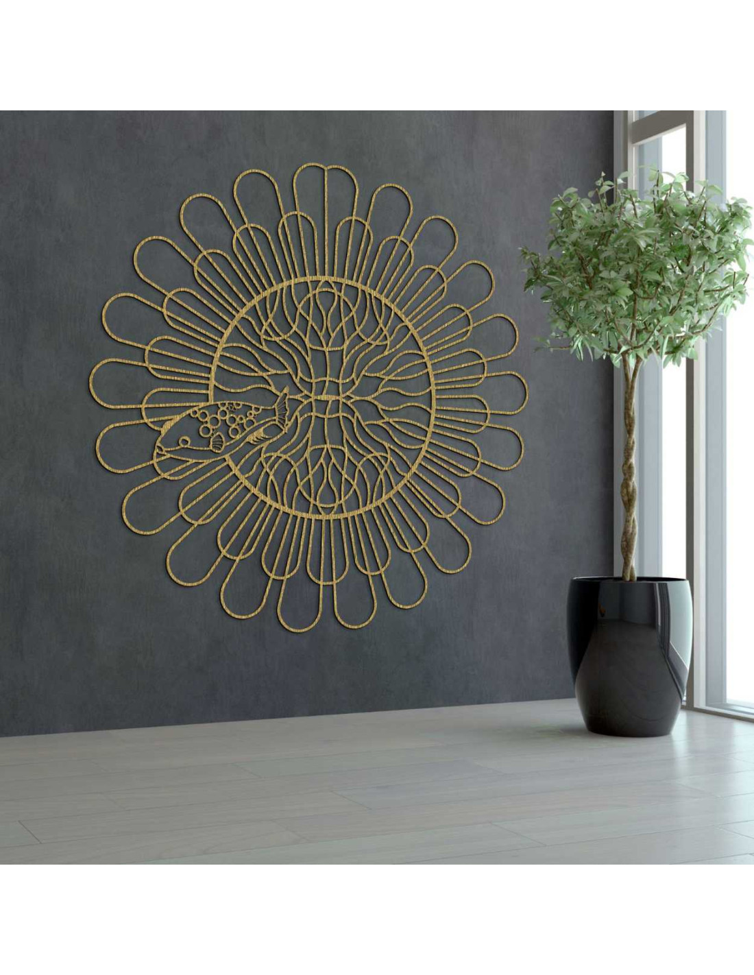Dekoratívna stena s dreveným kruhovým vzorom pripomínajúcim kvet alebo slnko, doplnená rybou.