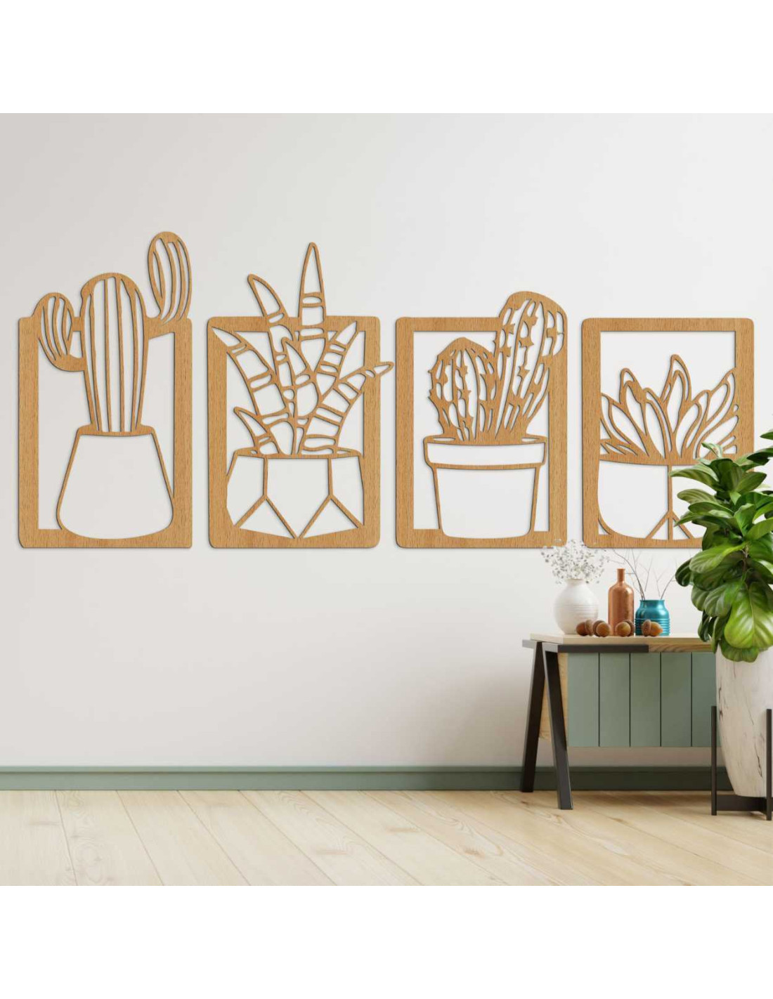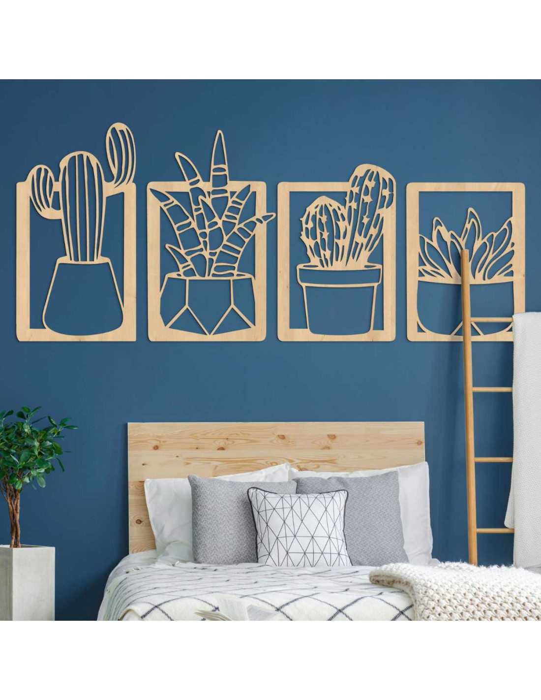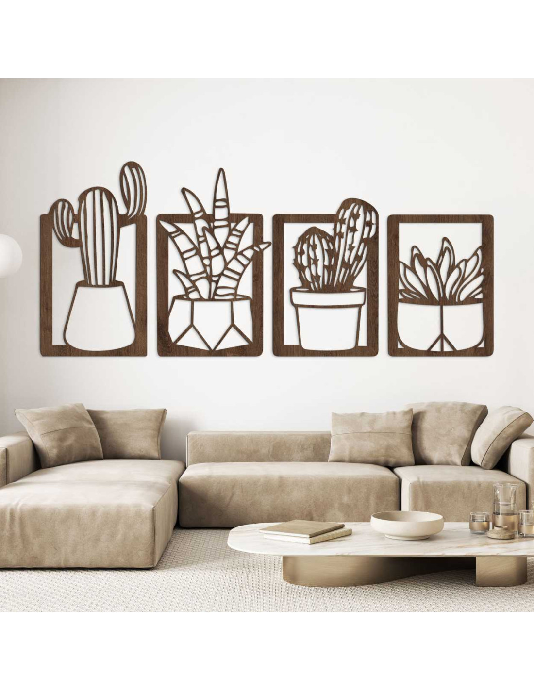 Moderná drevená dekorácia na stenu s rastlinným motívom kaktusov predstavuje štýlové spracovanie a jemný dizajn.