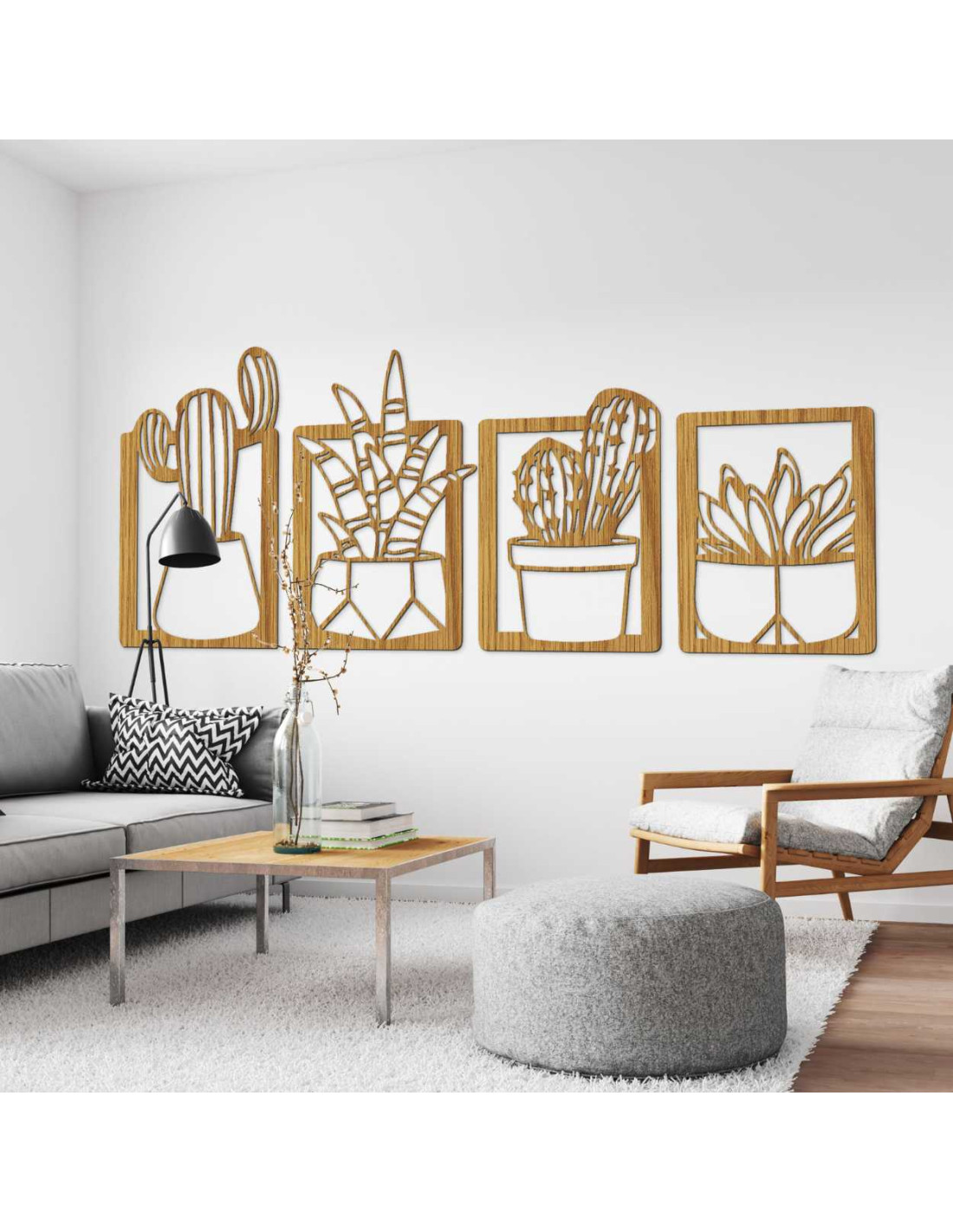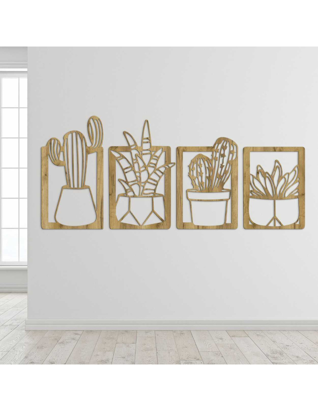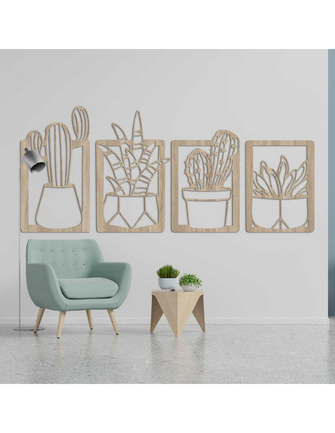 Moderná drevená dekorácia na stenu s rastlinným motívom kaktusov predstavuje štýlové spracovanie a jemný dizajn.