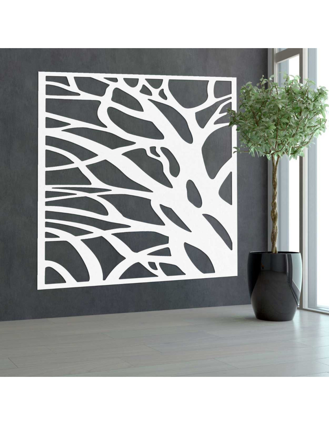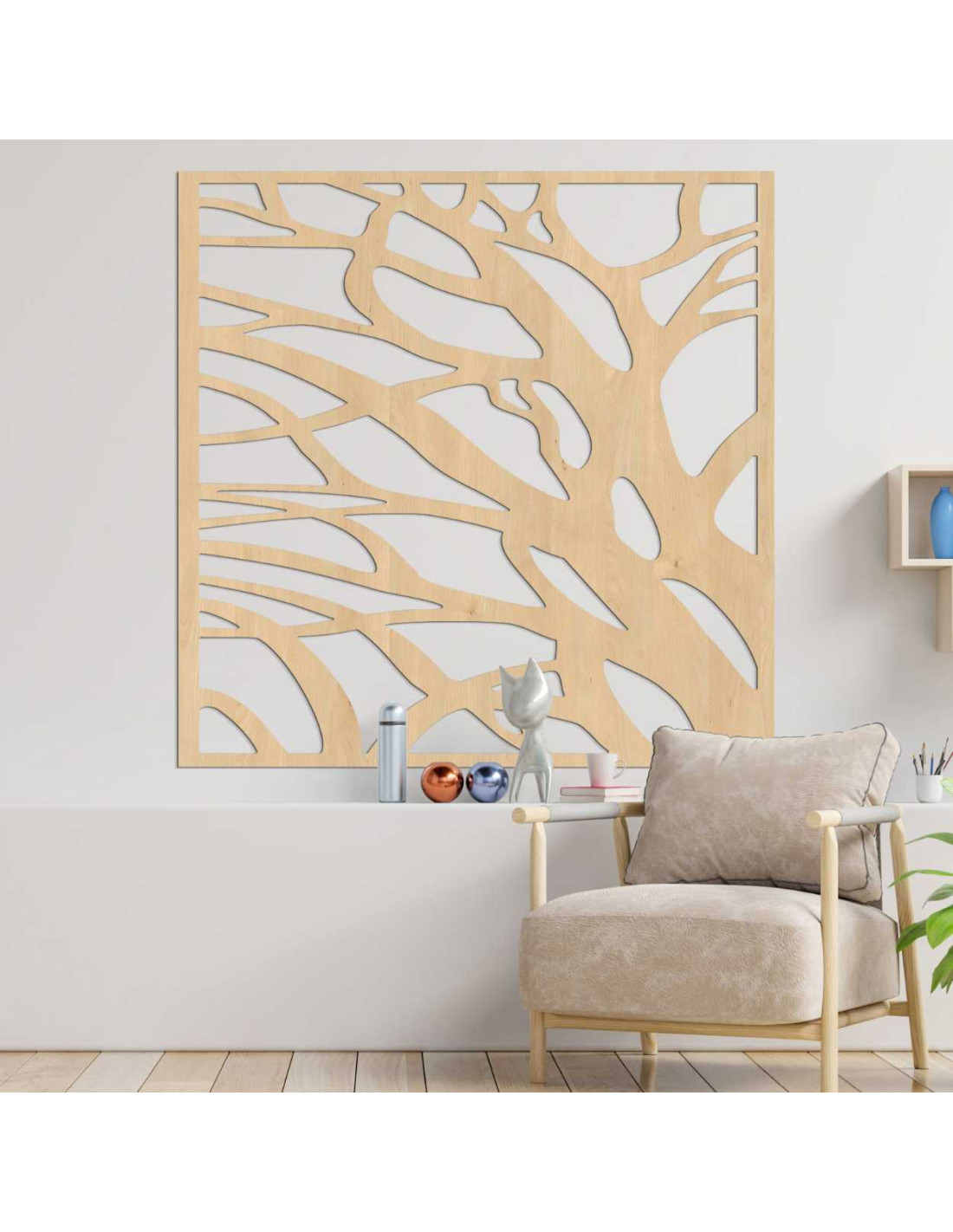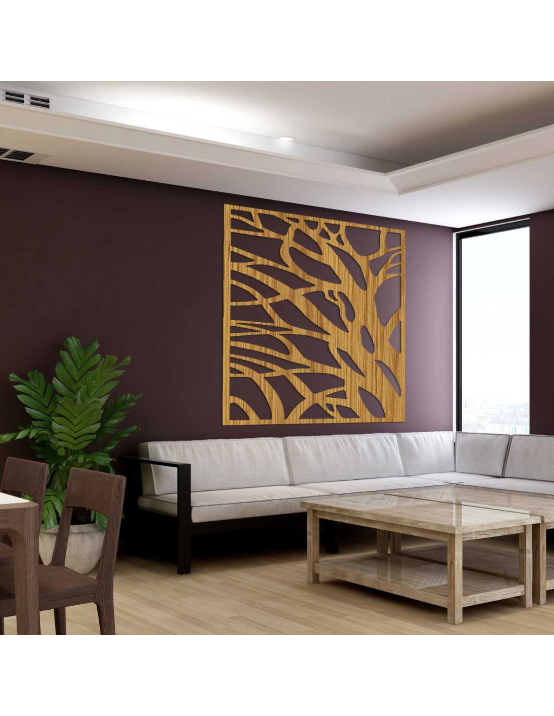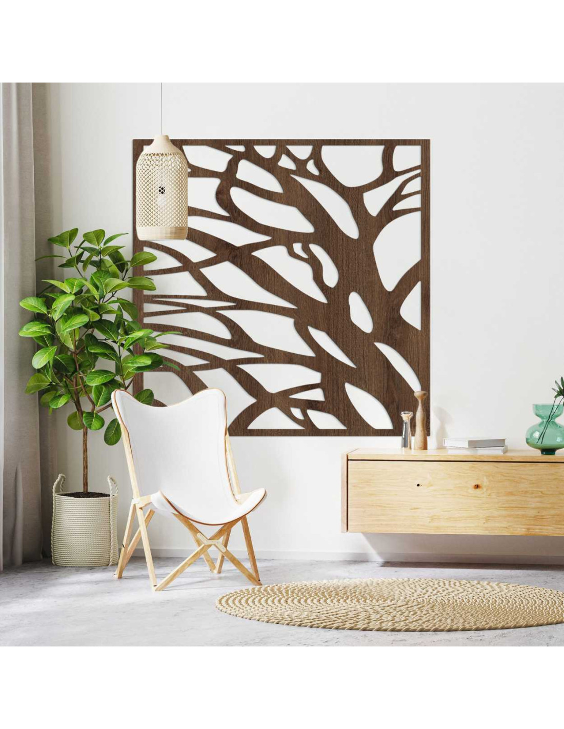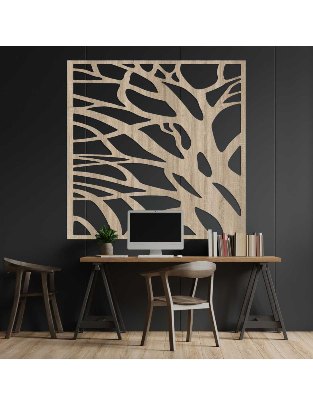 Moderná nástenná dekorácia s motívom stromu vyrezaného z dreva dodáva priestoru prírodný šmrnc a štýlovú hĺbku.