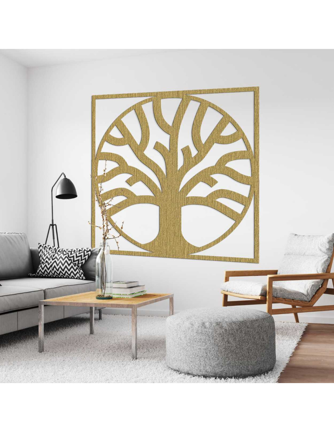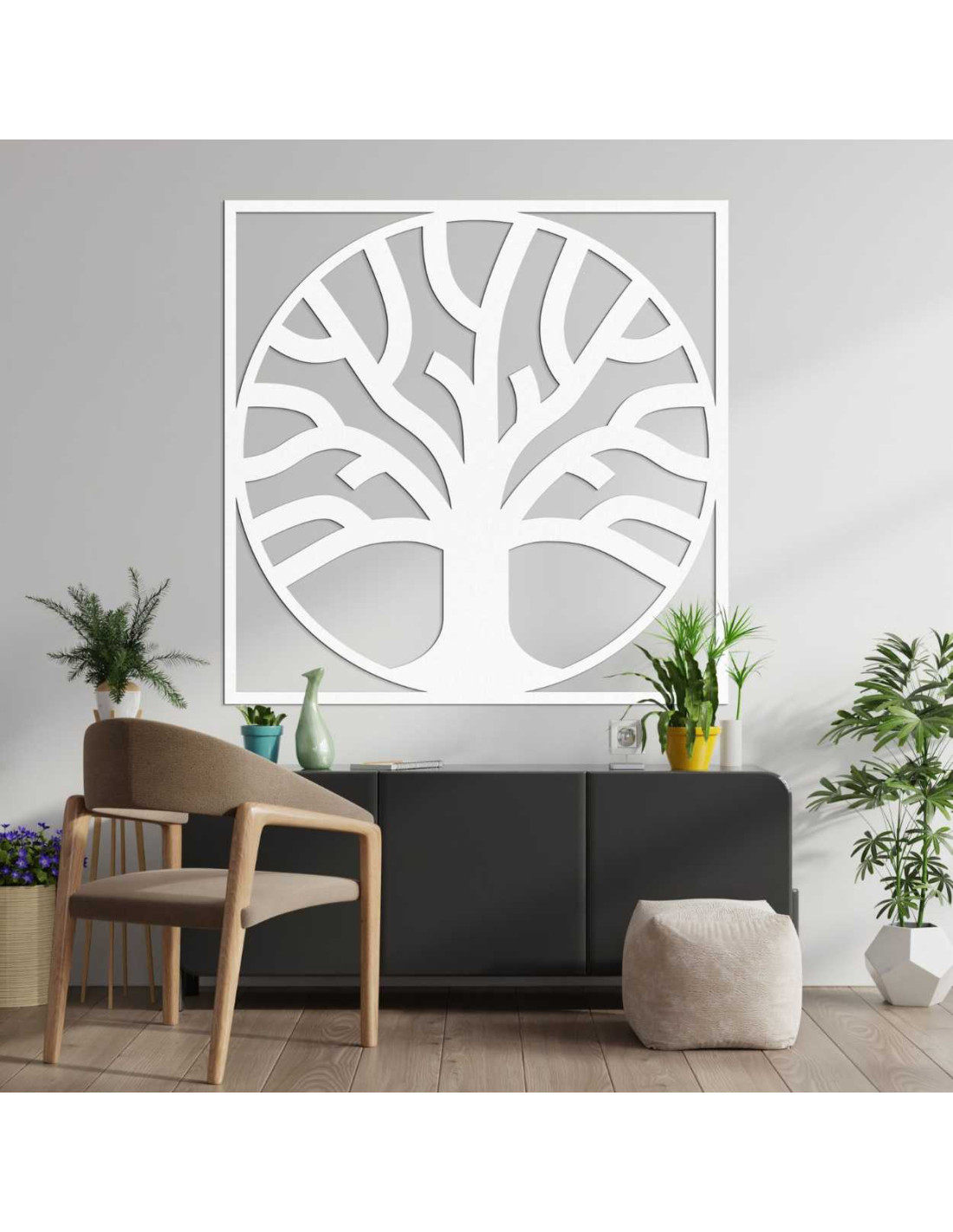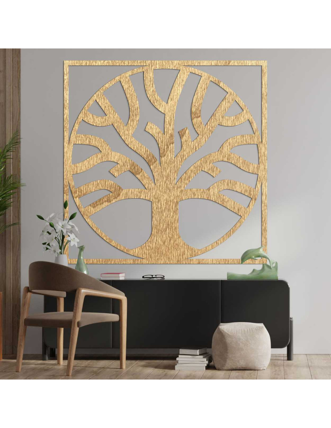 Drevený obraz so stromom života v štvorcovom ráme predstavuje spojenie prírodného materiálu s minimalistickou estetikou.