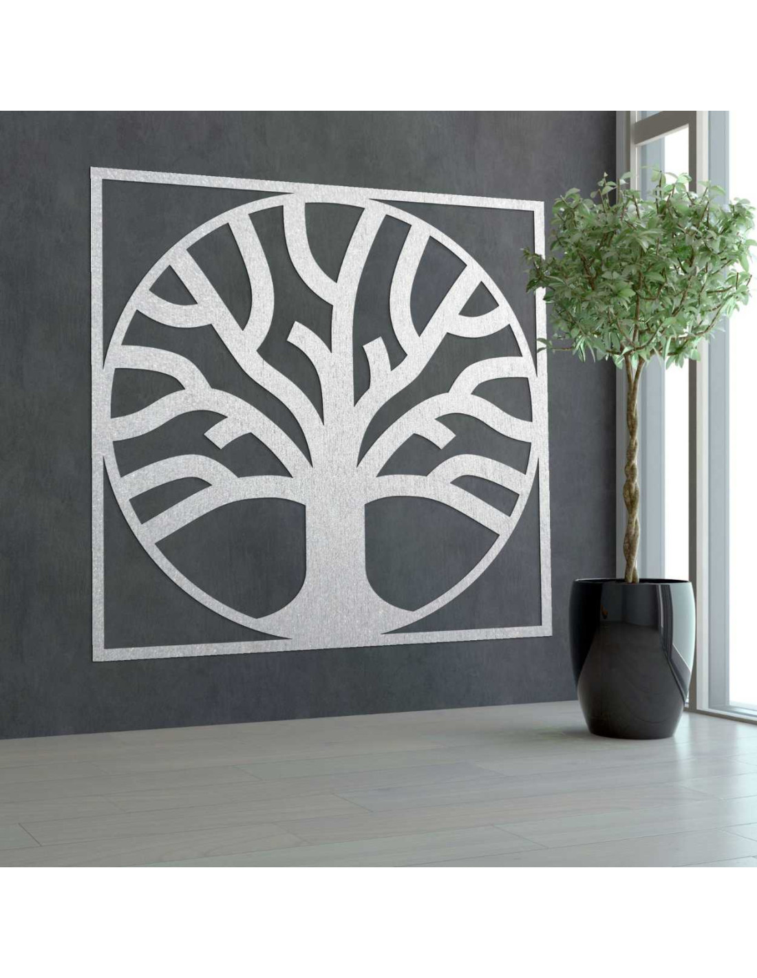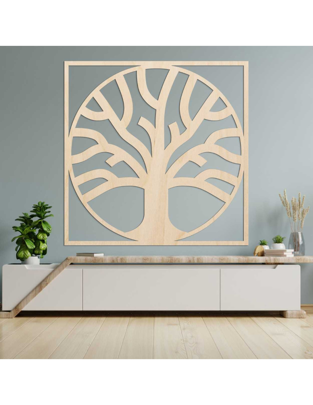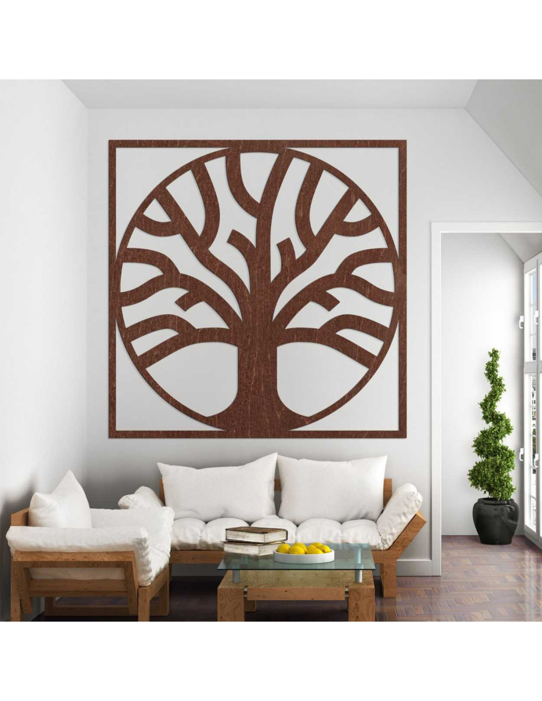 Drevený strom života s oblým tvarom a rámom v štvorcovom prevedení.