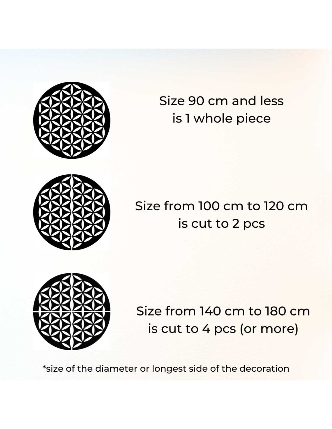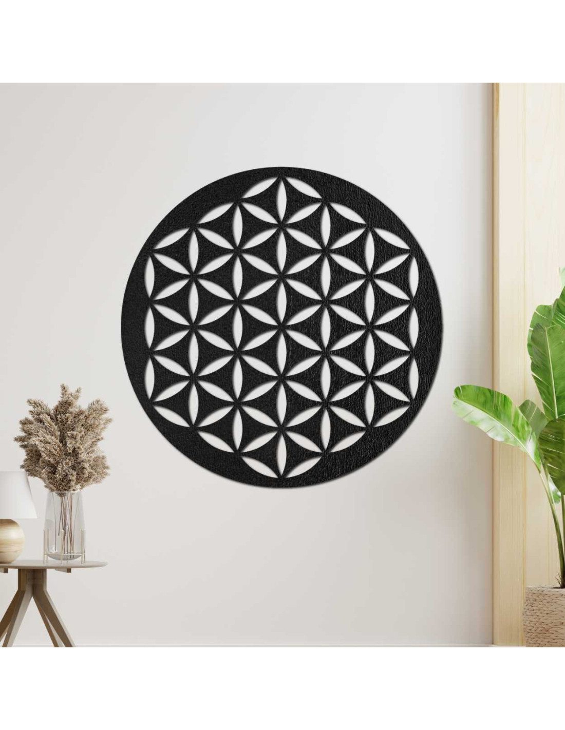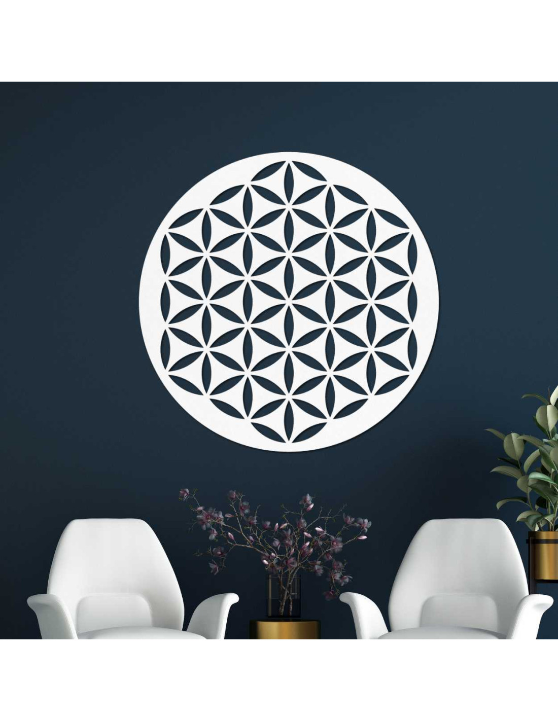 Geometrický motív kvetu života symbolizuje jednotu, rovnováhu a duchovný rast, čím pôsobí upokojujúco na atmosféru miestnosti.