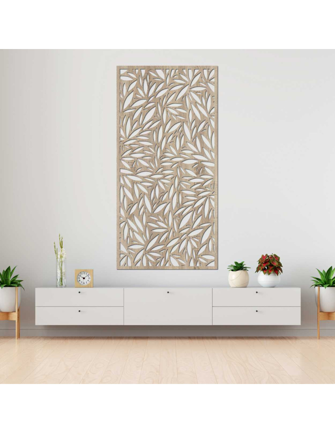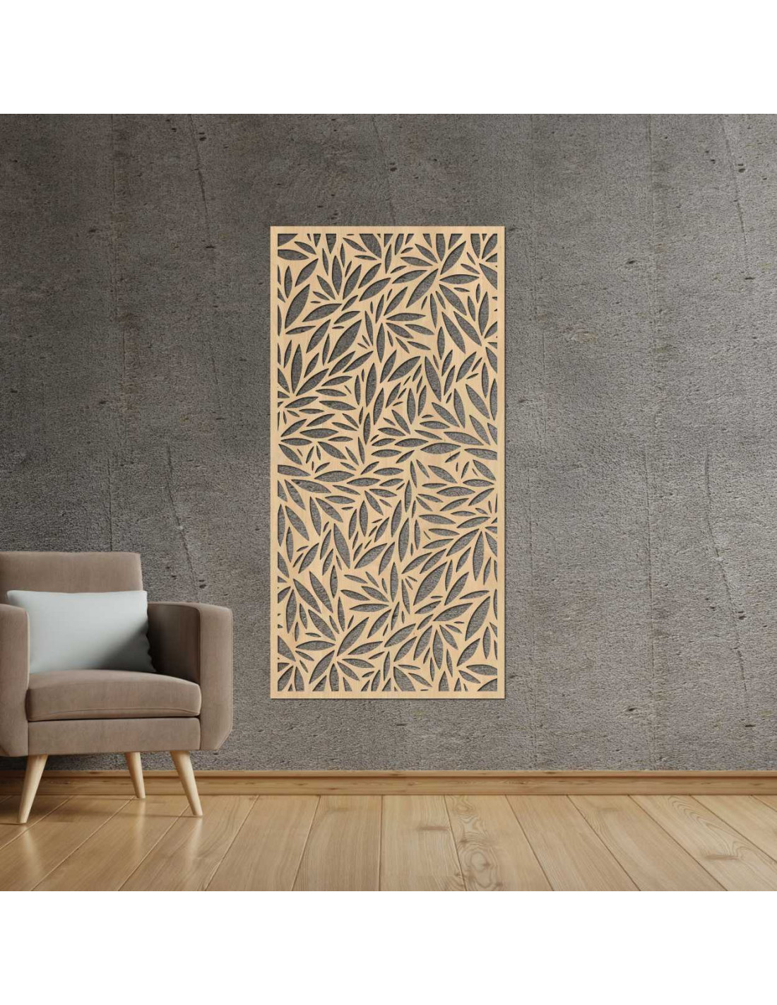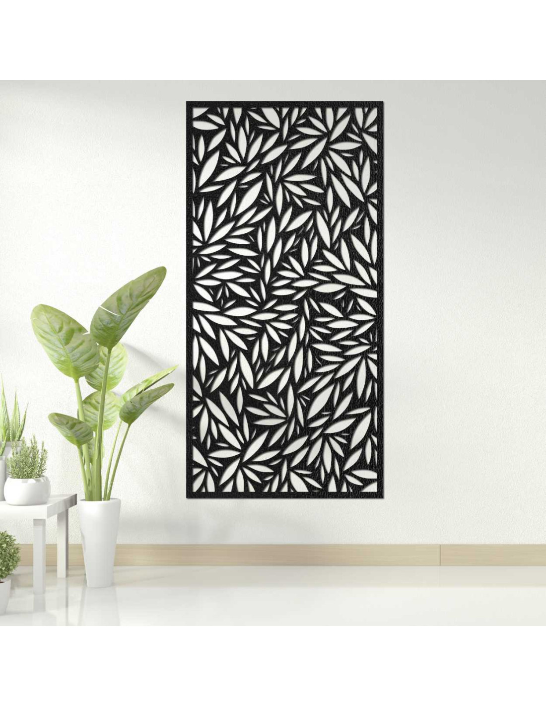Dekoratívny panel s výrezmi listov na svetlej stene
