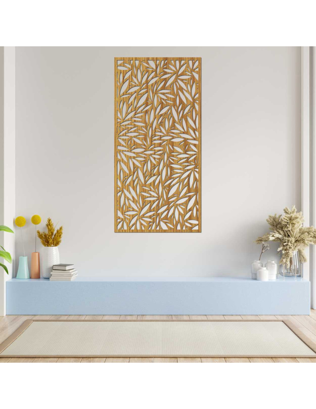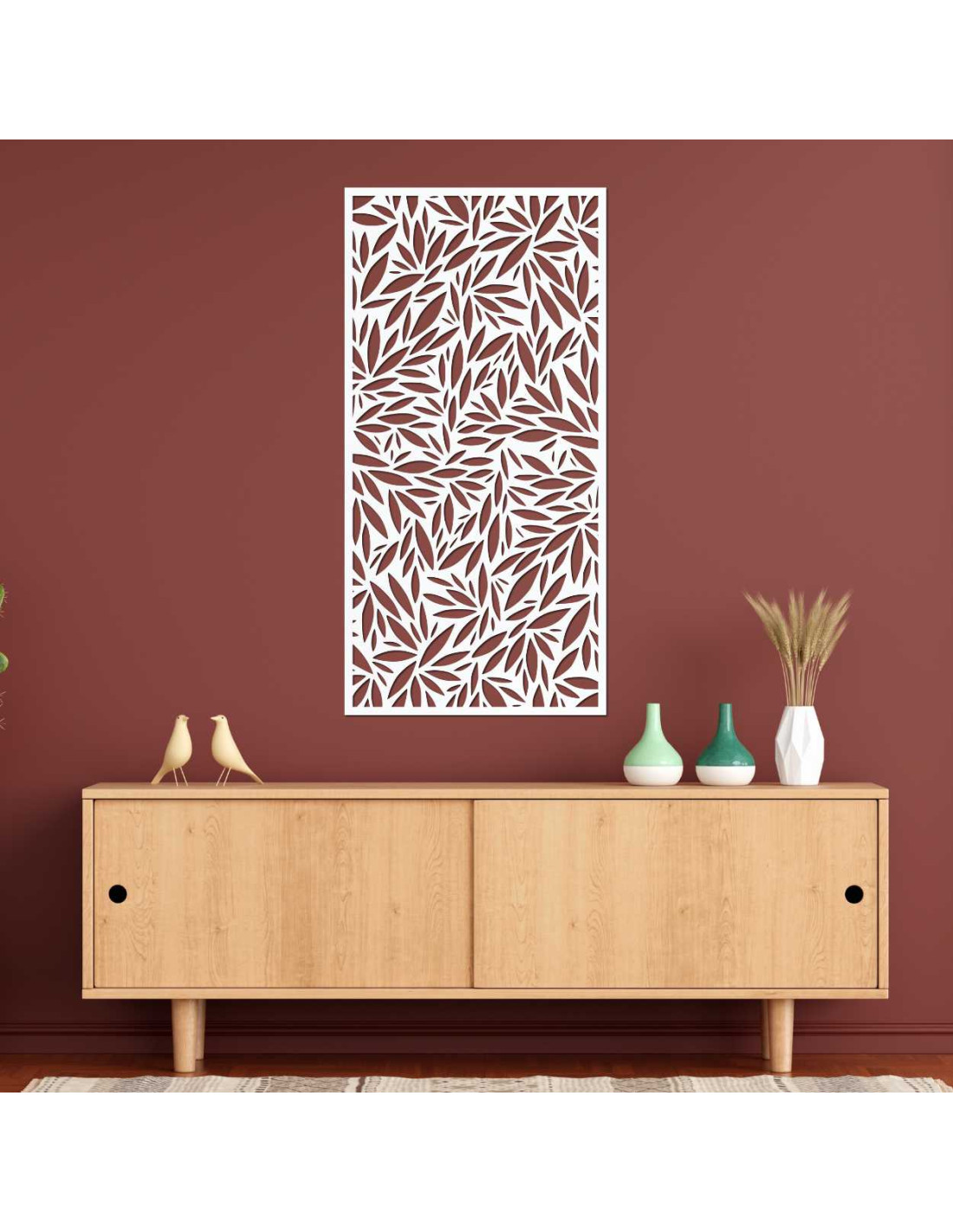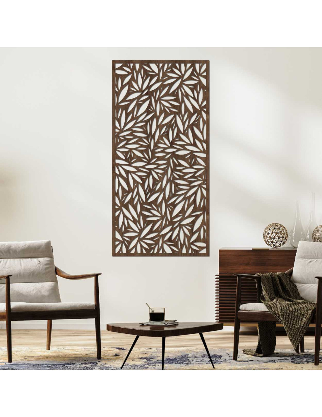 Dekoratívny panel s výrezmi listov na svetlej stene