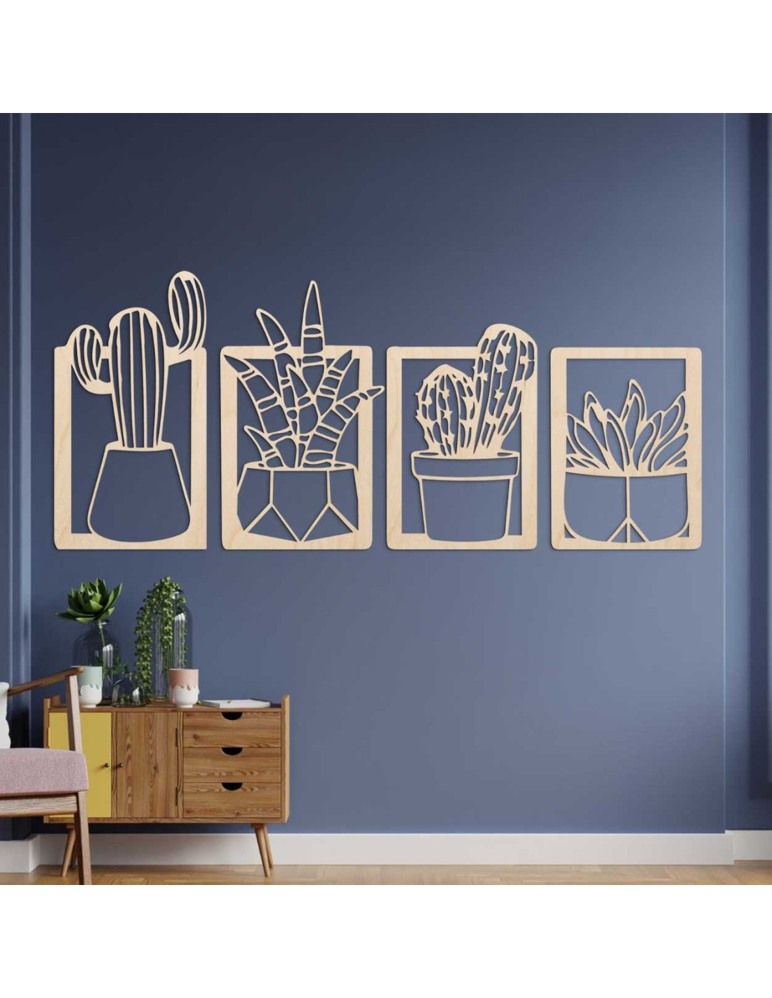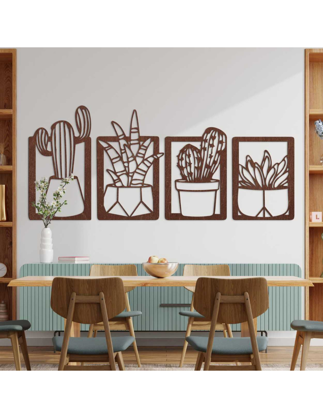 Drevená nástenná dekorácia so vzorom kaktusov a sukulentov oživí každú miestnosť svojím originálnym motívom rastlín.