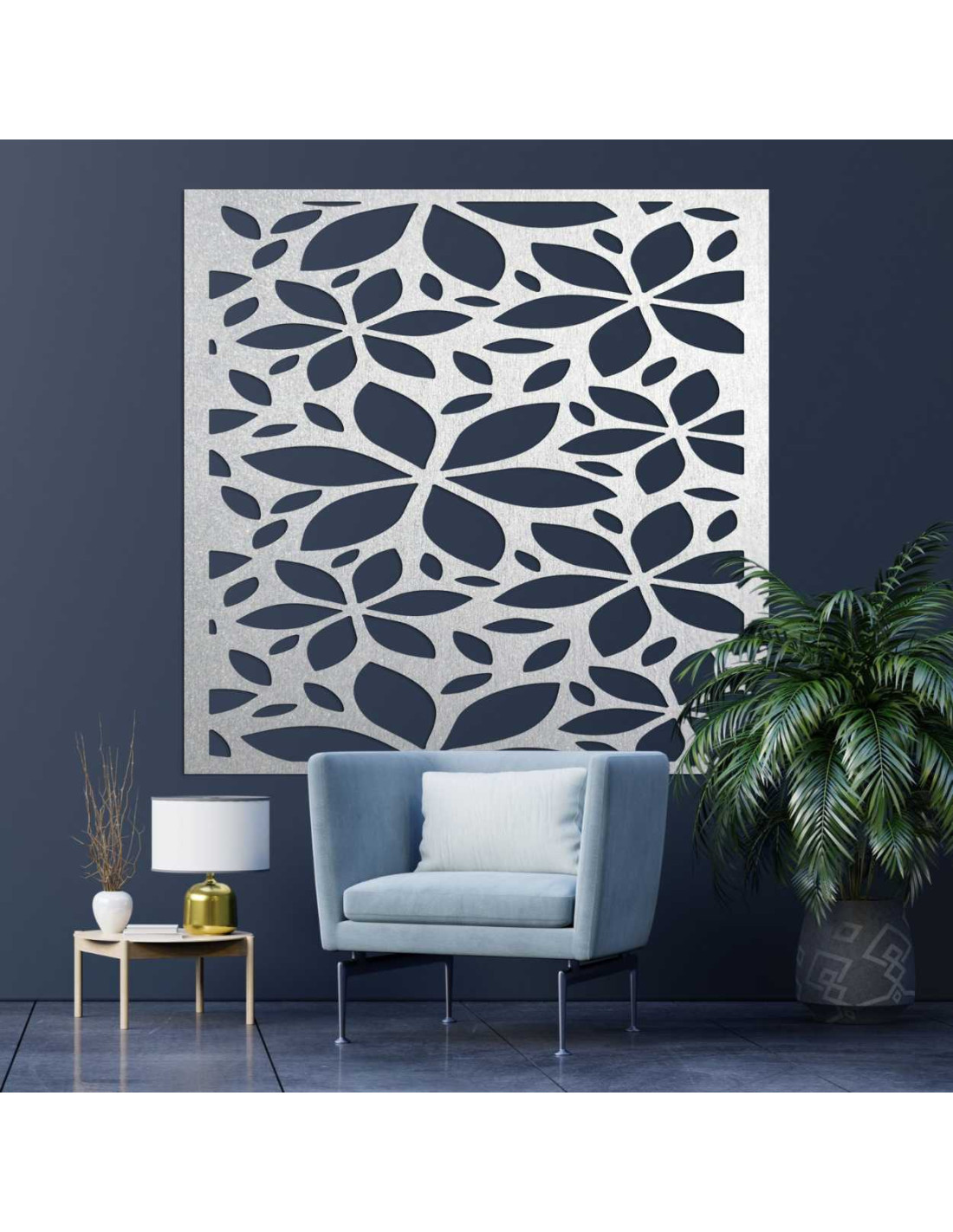 Organické línie a prepracovaný motív listov vytvárajú harmonickú súhru geometrie a prírody.