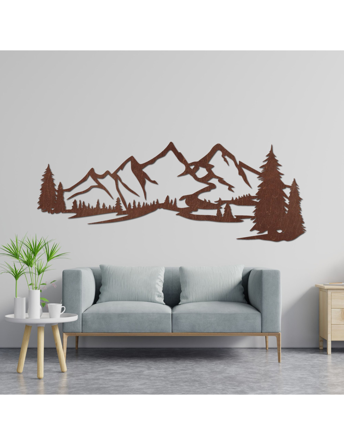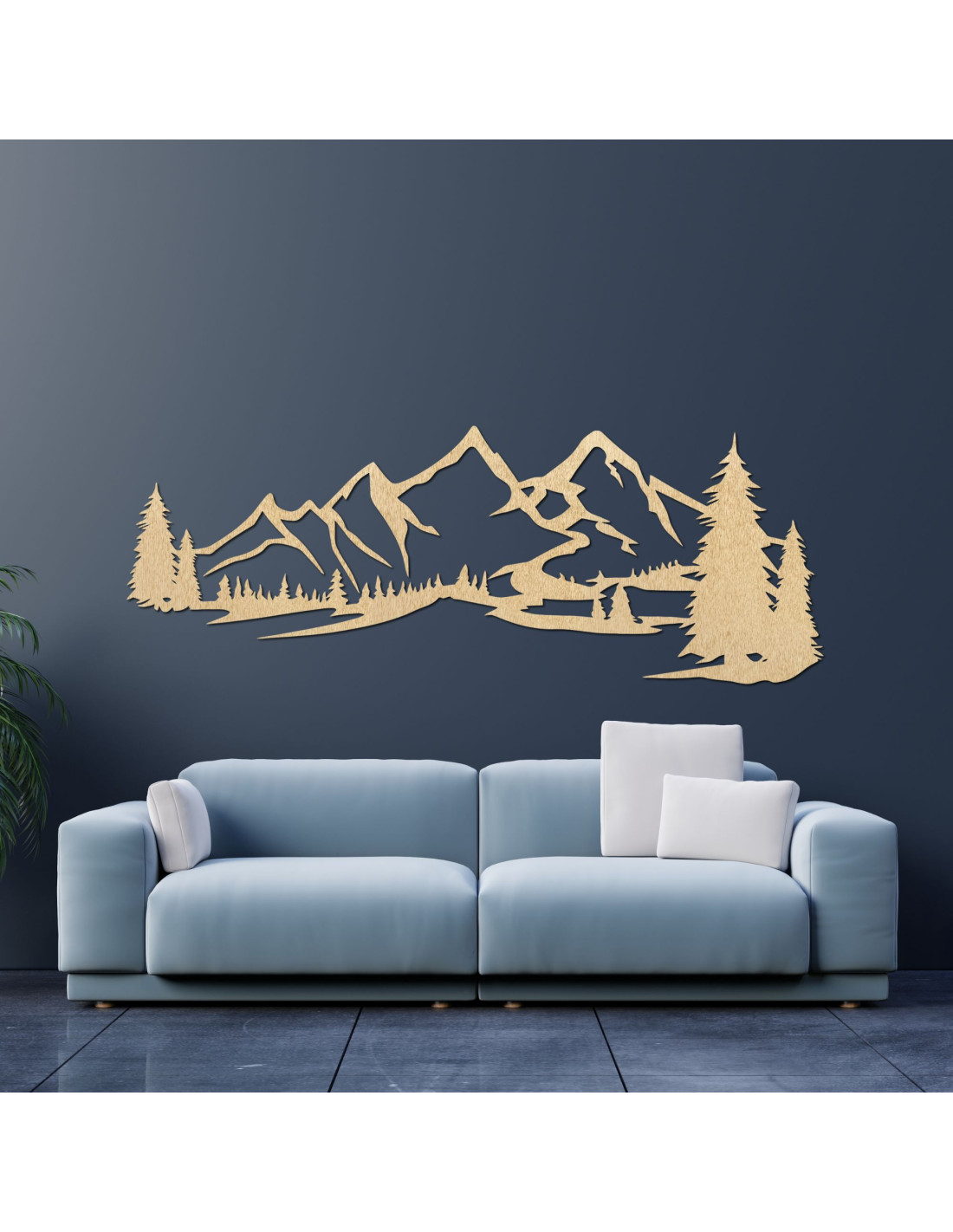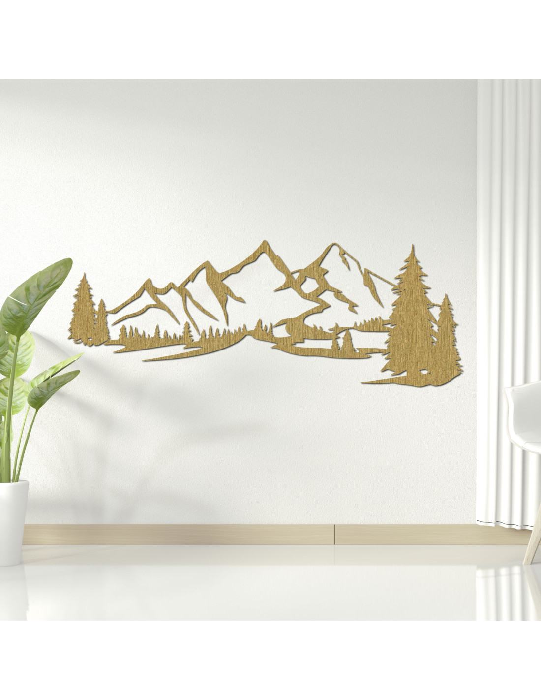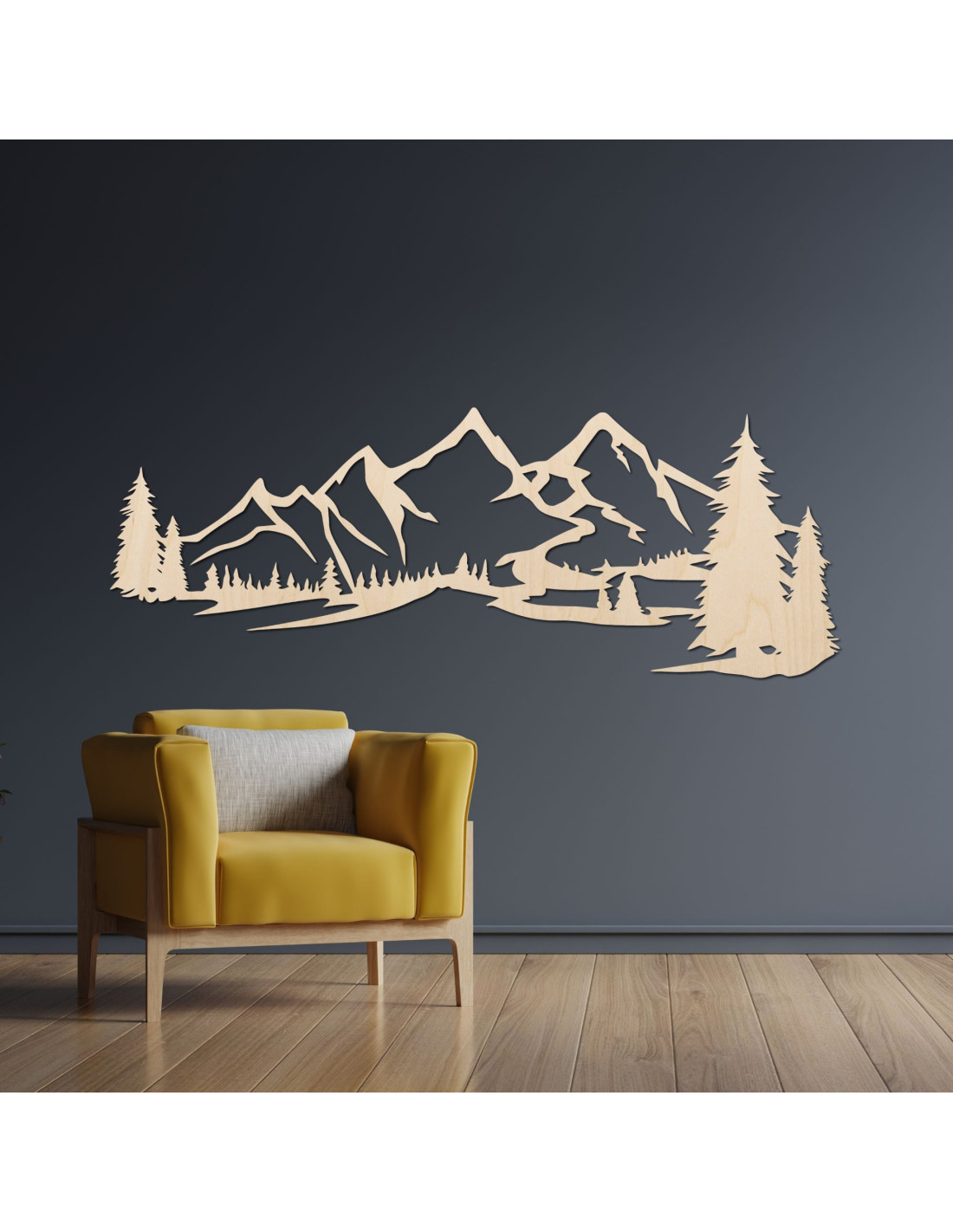 Drevená dekorácia na stenu s motívom horskej krajiny je moderným a elegantným doplnkom, ktorý prinesie do každého interiéru pokojný dotyk prírody.